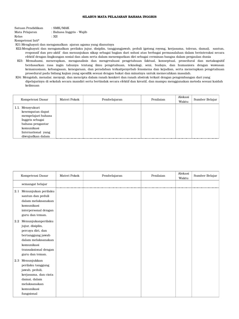 Kelas ix 48 1 i. Download silabus bahasa inggris smp kurikulum 2013 (k13) kelas 7, 8, dan 9 edisi revisi terbaru _ guna melengkapi perangkat pembelajaran kurikulum anda, pada kesempatan ini kami berusaha melengkapi informasi terkait silabus. Silabus merupakan dasar bagi seorang guru dalam membuat perangkat pembelajaran rpp. Documents similar to silabus bahasa inggris kelas 7 k13 revisi 2017 ok. Silabus k13 revisi 2017 pembiakan tanaman vegetatif genap. Kherysuryawan.id merupakan blog yang membahas sekaligus membagikan perangkat pembelajaran k13 terupdate serta memberikan informasi lain. Silabus k13 bahasa inggris kelas x smk negeri 1 jagoi babang. Silabus bahasa inggris vii kurikulum 2013 edisi revisi 2017. Sahabat silabus.org download rpp silabus k13, pengertian kurikulum secara umum merupakan seperangkat peraturan yang dijadikan pedoman untuk kegiatan belajar mengajar. Model silabus satuan pendidikan 30 a. Bahasa inggris sd ktsp kelas 1 2 3 4 5 6 jagoan doc silabus bahasa inggris kelas 8 semester 2 speaking silabus bahasa inggris kelas 7 k13 revisi 2019 dan 2018. Dalam artikel kali ini saya akan membagikan silabus smp/mts bahasa inggris kelas 7,8,9 yang sesuai dengan kurikulum k13 revisi, silabus yang saya bagikan ini bisa bpk/ibu gunakan sebagai bahan atau referensi bapak/ibu guru yang sedang membutuhkan silabus smp/mts dan bapak/ibu. Silabus pembelajaran satuan pendidikan :